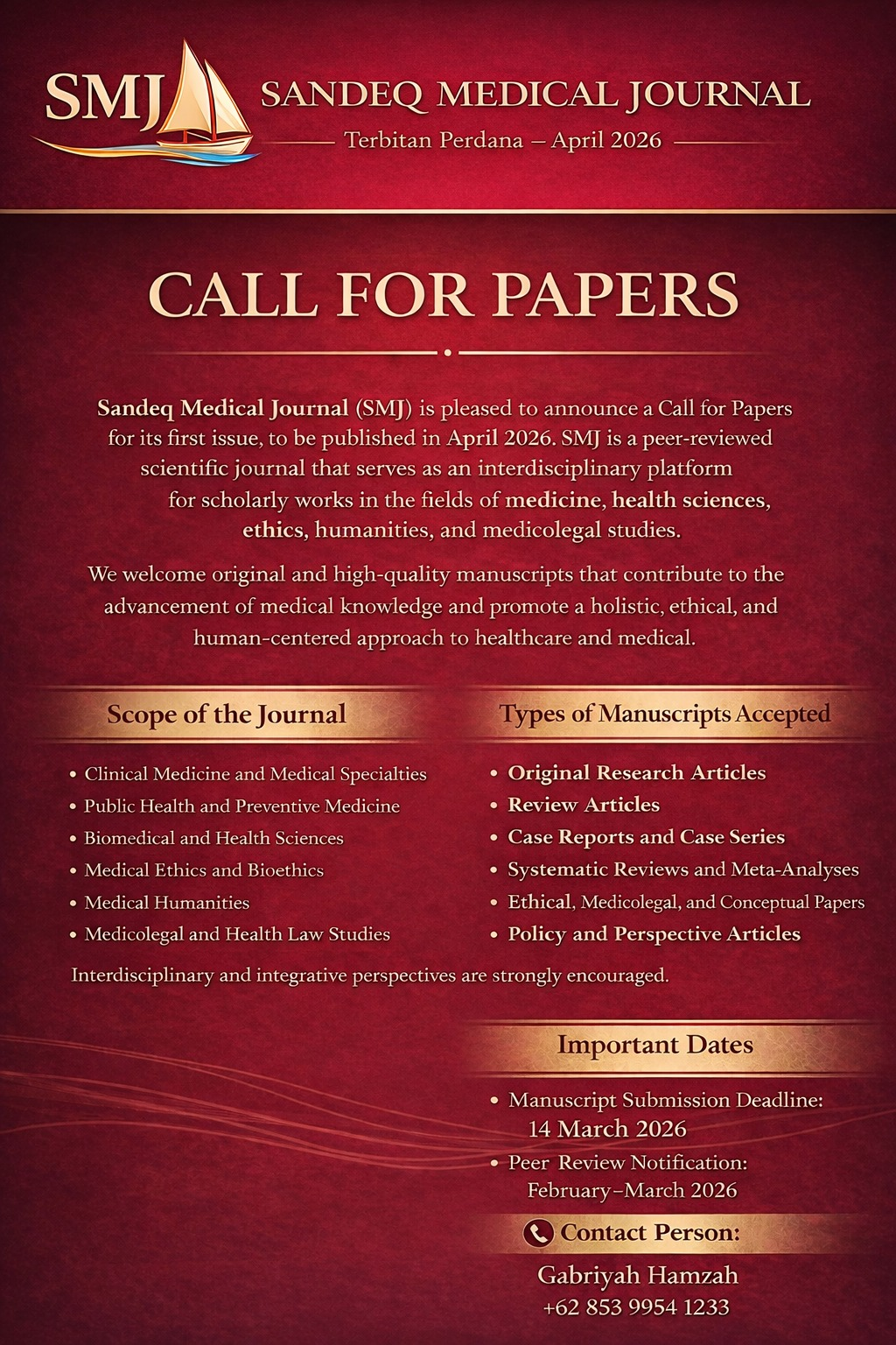 Sandeq Medical Journal (SMJ) dengan bangga mengumumkan Call for Papers untuk terbitan perdana yang akan diterbitkan pada April 2026. SMJ merupakan jurnal ilmiah peer-reviewed yang berfungsi sebagai wadah interdisipliner bagi karya-karya ilmiah di bidang kedokteran dan ilmu kesehatan, dengan pendekatan yang holistik, etis, dan berorientasi pada kemanusiaan.