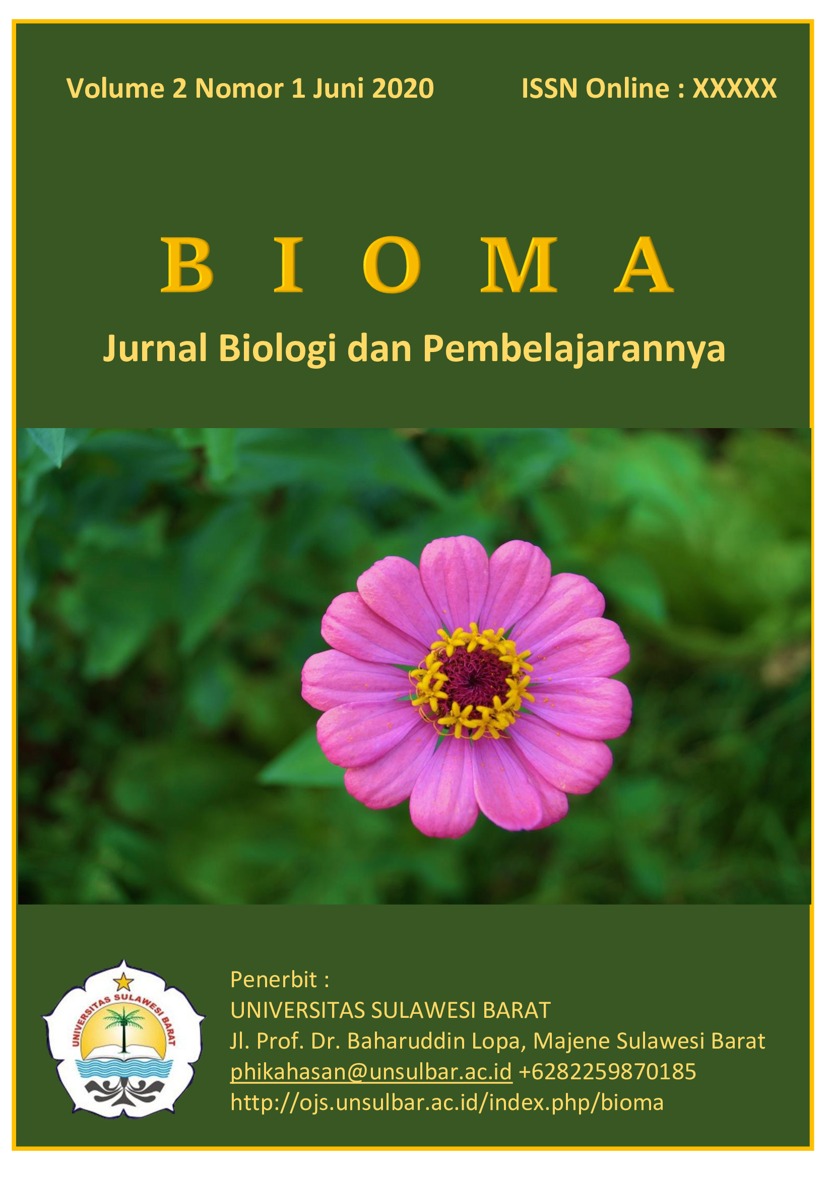 BIOMA : Jurnal Biologi dan Pembelajarannya diterbitkan oleh Universitas Sulawesi Barat. Terbit dua kali dalam setahun (Juni dan Desember) dengan tujuan sebagai media komunikasi ilmiah bidang Biologi dan pembelajarannya yang diangkat dari hasil penelitian atau studi literature. Redaksi menerima naskah dengan ketentuan penulisan seperti tercantum pada halaman sampul belakang. Naskah yang masuk ke redaksi BIOMA akan diseleksi oleh dewan redaksi