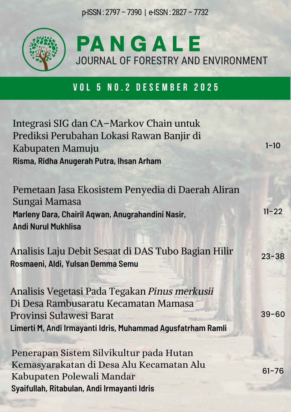 Pangale Journal of Forestry and Environment is a journal published by the Forestry Study Program, Faculty of Agriculture and Forestry, Universitas Sulawesi Barat. The journal publishes articles in the form of scientific research, policy analysis, field notes, and book reviews related to forestry and environmental issues with e ISSN 2827-7732. It is published twice a year in June and December.