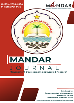 MANDAR: Management Development and Applied Research Journal is a peer-reviewed scientific publication that contains the results of research, development, studies, and thoughts within the scope of management and business research. MANDAR Journal is published by the Faculty of Economics, Sulawesi Barat University, since 2023 based on the Decree of the Director General of Higher Education, Research and Technology Number 177/E/KPT/2024 obtaining Sinta 4 accreditation rating. MANDAR has two types of ISSN (International Standard Serial Number), namely the print version with p-ISSN number 2721-1436 and the online version with e-ISSN number 2654-4504. MANDAR was first published in 2018 and is published periodically twice a year
