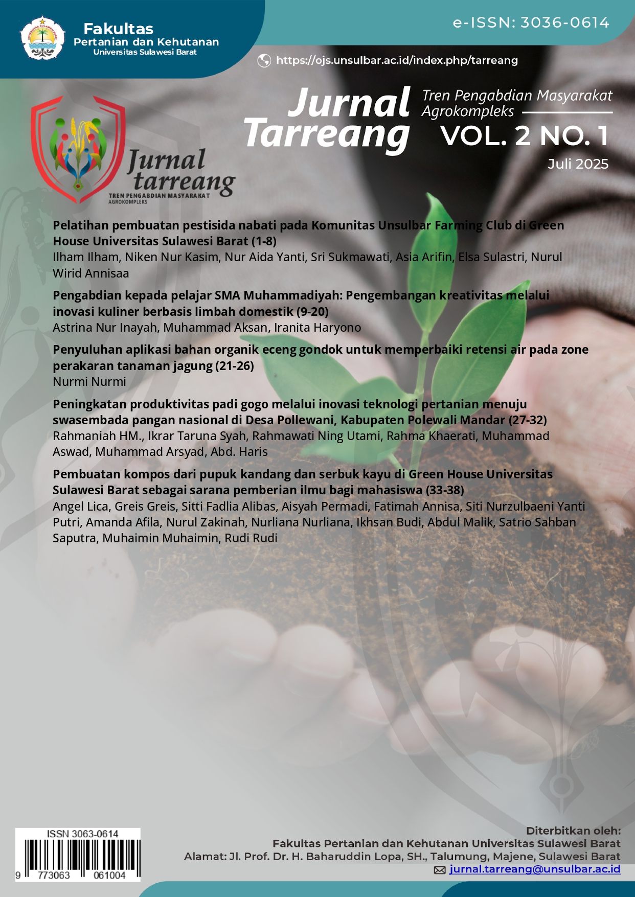 Jurnal Tarreang: Tren Pengabdian Masyarakat Agrokompleks is an open-access journal published by the Agriculture and Forestry Faculty, Universitas Sulawesi Barat, Indonesia that provides a platform for scholars, academicians, researchers, and employees, and to whom may concern to share the contemporary thoughts in the community service in agro-complex field (agriculture, plantation, forestry, husbandry, and fishery). Jurnal Tarreang will publish journals quarterly during March, July, and November. E-ISSN 3063-0614.